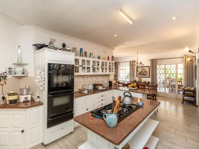 The open-plan kitchen, with a separate scullery, flows into the dining area and a light-filled lounge that opens onto a large veranda.